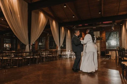 A couple dancing in an empty restaurant or banquet hall, with large windows, draped curtains, and wooden floors, during evening or nighttime.